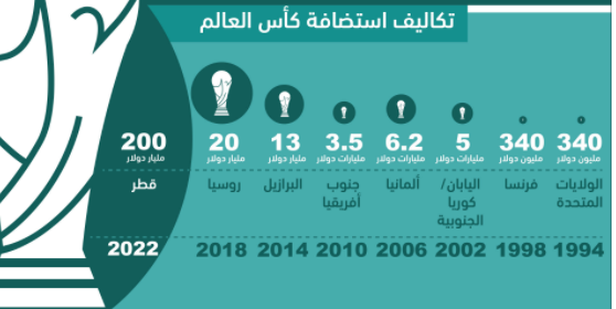 ويشار إلى أن تكاليف استضافة كأس العالم، لم تكن مرتفعة في السابق. ففي العام 1994، استضافت الولايات المتحدة كأس العالم، ووصلت قيمة الإنفاق حينها على تنظيم مباريات كأس العام إلى ما يقارب 340 مليون دولار، أما في دورة كأس العالم عام 1998، فقد استضافت فرنسا المباريات، ووصلت حينها التكاليف إلى ما يقارب 340 مليون دولار، في حين قفزت تكاليف استضافة كأس العالم في العام 2002، والتي أقيمت في كوريا الجنوبية واليابان، ووصلت إلى ما يقارب 5 مليارات دولار.