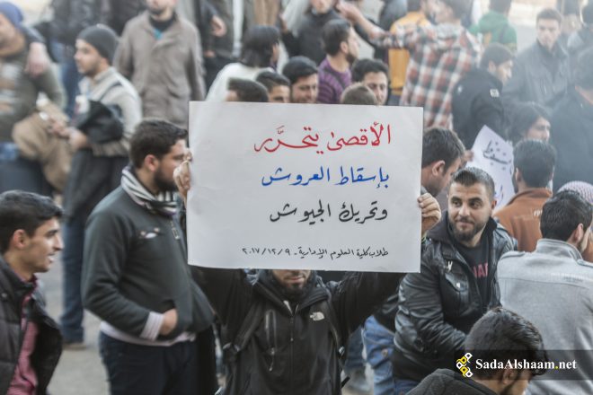 وفي السياق، نظم طلاب جامعة “حلب الحرة” اعتصاماً في مدينة معرة النعمان في ريف إدلب الجنوبي، تنديداً بقرار إعلان القدس عاصمة لإسرائيل.
