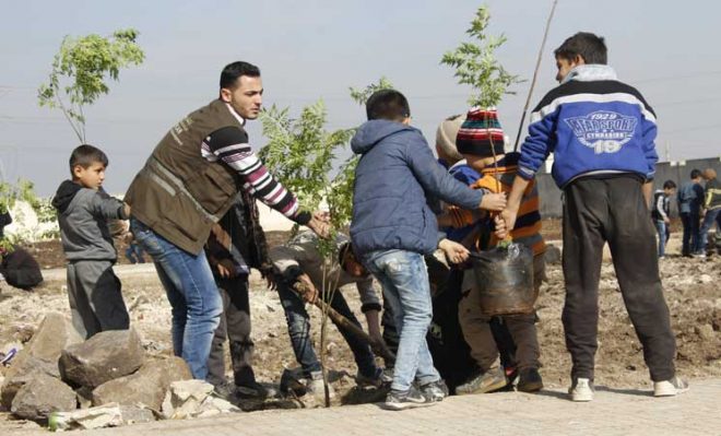 يتنقل أطفال ريف حمص الشمالي المحاصر وسط سوريا، في مجموعات، لزرع أشجار في مدن وبلدات المنطقة.
