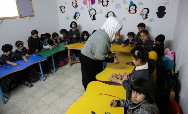 داخل أحد فصول “مركز جسور العلم” وقف المعلم السوري، محمد القلعاني، يشرح لعدد من طلاب المرحلة الإعدادية أحد دروس مادة الرياضيات باللهجة الدمشقية، وبدا وكأنه يشعل حماسة الطلاب اللاجئين، ويعيد إليهم ذكريات الدراسة في بلدهم.
