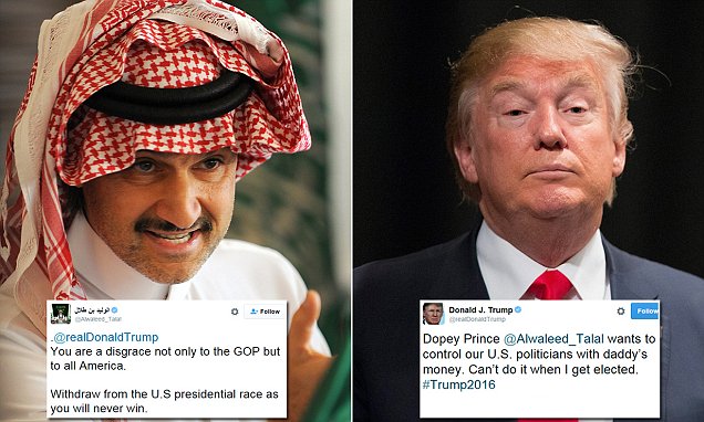 وكان ترامب دخل في “عراك” على “تويتر” نفسه مع الوليد بن طلال، الذي انتقده خلال حملته للانتخابات الرئاسية بسبب موقفه العدائي من المسلمين.