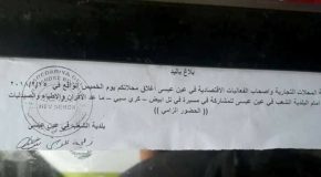 وأصدرت “بلدية الشعب في عين عيسى” التابعة للإدارة الذاتية الكردية، قراراً طالبت فيه المدنيين بإغلاق المحلات و الفعاليات الاقتصادية من أجل الخروج بمسيرة في مدينة تل أبيض يوم الخميس القادم و ذلك بشكل إلزامي.