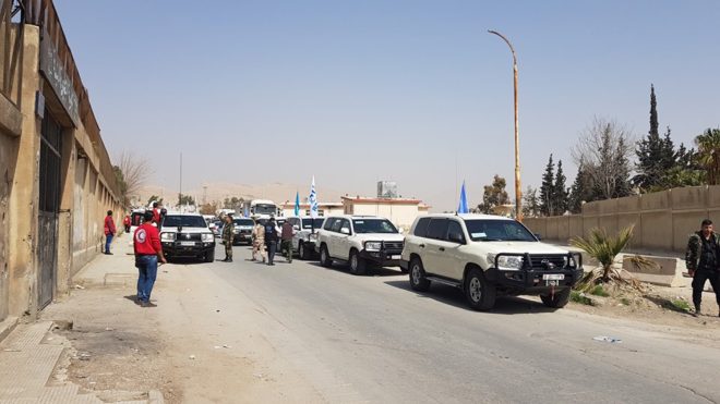 دخلت قافلة مساعدات مقدّمة من الأمم المتحدة والصليب الأحمر الدولي والهلال الأحمر السوري اليوم الاثنين، إلى الغوطة الشرقية المحاصرة في ريف دمشق.