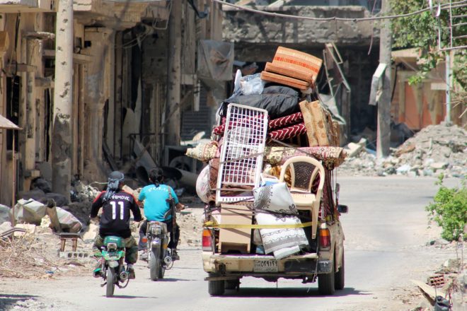 ونشر ناشطون على مواقع التواصل الاجتماعي صوراً تظهر شاحنات مكدسة بأثاثات المنازل تغادر حرستا