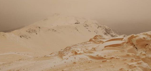 ويعتقد أن هذا المنظر غير الاعتيادي قد يكون نتيجة للغبار الذي اختلط بالهواء الجوي من العواصف شمال أفريقيا، قبل أن يترسب في المنطقة مع الثلوج.