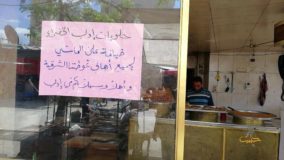 وفي هذه الصورة، اختصر صاحب أحد محلات الألبسة حجم التماسك بين السوريين بعبارة وضعها داخل محلّه جاء فيها باللهجة السورية: “أهلنا في الغوطة المحل على حسابكم”.