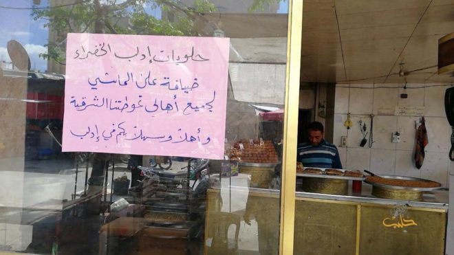 في هذه الصورة يظهر مطعم يُدعى “سفلو” في مدينة إدلب، دعا مهجّري الغوطة إلى القدوم إليه والحصول على الوجبات الغذائية مجاناً.