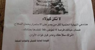 جدّدت الطائرات الحربية التابعة للنظام السوري، إلقاء المناشير التحذيرية فوق المدنيين في مدينة درعا، والصادرة عن قيادة يش النظام. وقالت مصادر محلية لـ “صدى الشام”: “إن الطائرات المروحية ألقت المناشير فوق بلدات الحارة وجاسم ونوى في ريف محافظة درعا، الخاضع لسيطرة المعارضة السورية. وجاء في المنشوارت: “لا تكن كالهواء.. هذه …