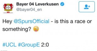 تعرض الحساب الرسمي لنادي باير لفركوزن الألماني على “تويتر” لموقف محرج، بعدما حاول “استفزاز” توتنهام هوتسبير الإنجليزي منافسه في المجموعة الخامسة بدوري أبطال أوروبا. ونشر حساب ليفركوزن تغريدة يتهكم فيها على تأخر الفريق الإنجليزي على أرضه ووسط جماهيره، قبل أن ينقلب السحر على الساحر. وكان الفريق الألماني يواجه ضيفه سسكا …